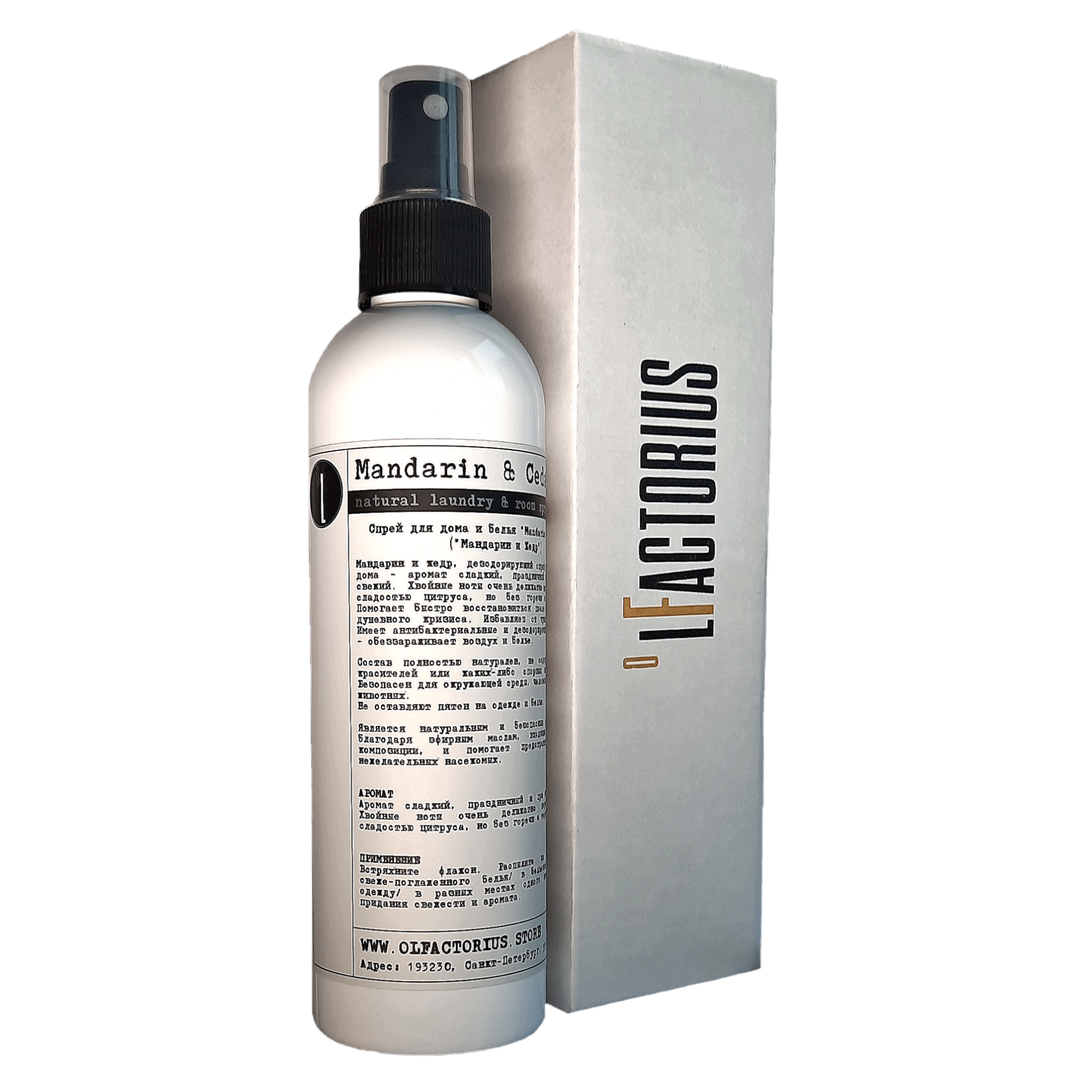 Мандарин и кедр, дезодорирующий спрей для белья и дома - аромат сладкий, праздничный и при этом свежий. Хвойные ноты очень деликатно переплетены со сладостью цитруса, но без горечи и терпкости. Помогает быстро восстановиться после болезни или душевного кризиса. Избавляет от чувства страха. Имеет антибактериальные и дезодорирующиие свойства - обеззараживает воздух и белье. Состав полностью натурален и безопасен для окружающей среды, человека и домашних животных.